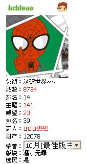 等级:荣誉站长 主题:332 精华:0 贴子:9059 排名:127 威望:121 排名:3 注册:2004/1/20 18:03:00 近访:2010/12/18 10:53:28 |