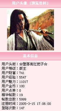 等级:大四 主题:65 精华:1 贴子:5183 排名:49 威望:17 排名:95 注册:2004/2/19 15:26:00 近访:2008/12/9 22:01:47 |