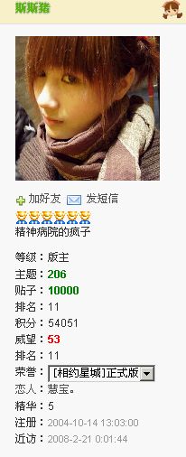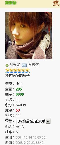 等级:大一 主题:39 精华:0 贴子:2762 排名:52 威望:5 排名:223 注册:2007/3/20 14:03:38 近访:2009/7/20 1:51:33 |