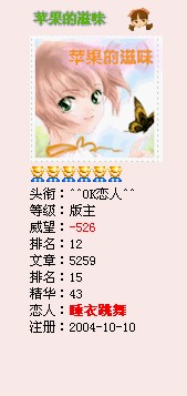 主题:苹果的威望``````还有 我又成试用斑竹了``````` |