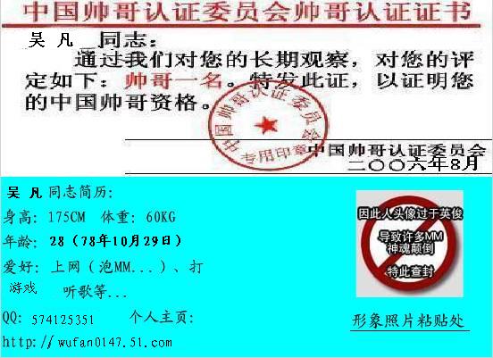 我的帅哥认证书 Post By:2007/4/1 23:02:00