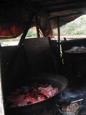 在那个堪称“垃圾填埋场”的后院里面转悠了大概10分钟的样子,记者在撤离的过程中见到了这样的一幕:一个矮矮的中年男子,用一把大铁铲来回翻动着锅里的肉和动物内脏,然后用一个大勺将锅里半熟的肉捞到一个水桶里面,接着再倒到摊开在地上的油布上;两个中年妇女则在不停地“肢解”着刚刚出锅还冒着热气的肉。一次倒肉的过程中,中年男子不小心将一块肉倒到了油布的外面,在地上滚过的肉立马就涂上了一层黑油,尽管如此,中年女子还是很快地将肉拨了回来……