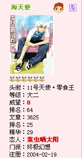 等级:大三 主题:571 精华:0 贴子:4607 排名:2195 威望:22 排名:79 注册:2004/2/19 16:54:00 近访:2009/6/24 23:40:44 |