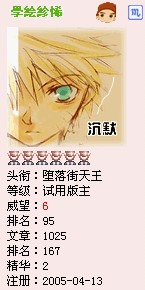 等级:高二 主题:43 精华:0 贴子:1534 排名:3174 威望:13 排名:120 注册:2005/3/3 12:44:00 近访:2006/9/11 1:47:31 |