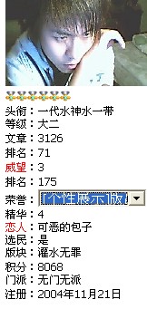 等级:小二 主题:9 精华:0 贴子:157 排名:0 威望:0 排名:0 注册:2005/10/17 1:07:00 近访:2006/4/19 10:52:18 |
